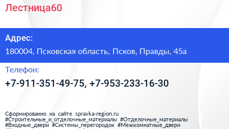 Лестница60 по адресу 180004, Псковская область, Псков, Правды, 45а в дальнейшем Организация, размещена в следующих категориях: