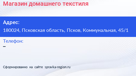 Магазин домашнего текстиля по адресу 180024, Псковская область, Псков, Коммунальная, 45/1 в дальнейшем Организация, размещена в следующих категориях:
