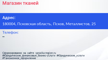 Магазин тканей по адресу 180004, Псковская область, Псков, Металлистов, 25 в дальнейшем Организация, размещена в следующих категориях: