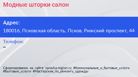 Модные шторки, салон по адресу 180016, Псковская область, Псков, Рижский проспект, 44 в дальнейшем Организация, размещена в следующих категориях: