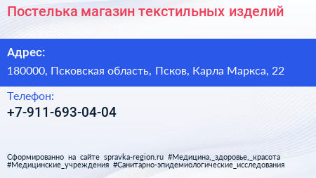 Постелька, магазин текстильных изделий по адресу 180000, Псковская область, Псков, Карла Маркса, 22 в дальнейшем Организация, размещена в следующих категориях: