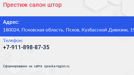Престиж, салон штор по адресу 180024, Псковская область, Псков, Кузбасской Дивизии, 19 в дальнейшем Организация, размещена в следующих категориях: