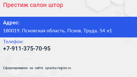 Престиж, салон штор по адресу 180019, Псковская область, Псков, Труда, 54 к1 в дальнейшем Организация, размещена в следующих категориях: