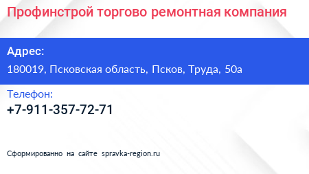 Профинстрой, торгово-ремонтная компания по адресу 180019, Псковская область, Псков, Труда, 50а в дальнейшем Организация, размещена в следующих категориях: