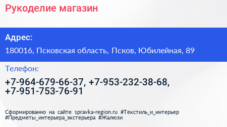 Рукоделие, магазин по адресу 180016, Псковская область, Псков, Юбилейная, 89 в дальнейшем Организация, размещена в следующих категориях: