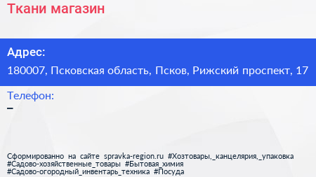 Ткани, магазин по адресу 180007, Псковская область, Псков, Рижский проспект, 17 в дальнейшем Организация, размещена в следующих категориях: