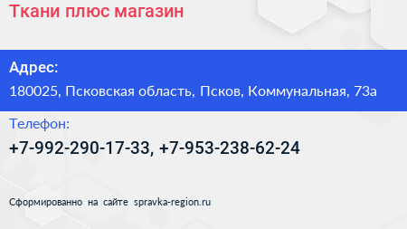 Ткани плюс, магазин по адресу 180025, Псковская область, Псков, Коммунальная, 73а в дальнейшем Организация, размещена в следующих категориях: