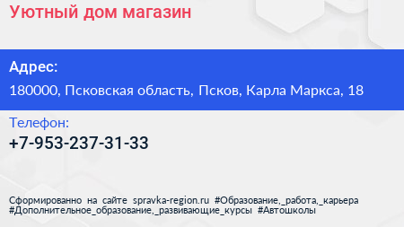 Уютный дом, магазин по адресу 180000, Псковская область, Псков, Карла Маркса, 18 в дальнейшем Организация, размещена в следующих категориях: