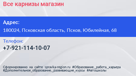 Все карнизы, магазин по адресу 180024, Псковская область, Псков, Юбилейная, 68 в дальнейшем Организация, размещена в следующих категориях: