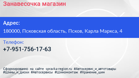 Занавесочка, магазин по адресу 180000, Псковская область, Псков, Карла Маркса, 4 в дальнейшем Организация, размещена в следующих категориях: