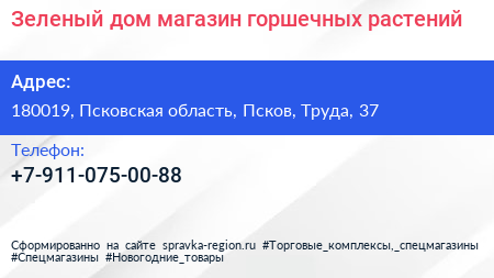 Зеленый дом, магазин горшечных растений по адресу 180019, Псковская область, Псков, Труда, 37 в дальнейшем Организация, размещена в следующих категориях: