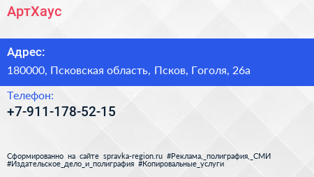 АртХаус по адресу 180000, Псковская область, Псков, Гоголя, 26а в дальнейшем Организация, размещена в следующих категориях: