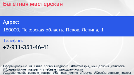 Багетная мастерская по адресу 180000, Псковская область, Псков, Ленина, 1 в дальнейшем Организация, размещена в следующих категориях: