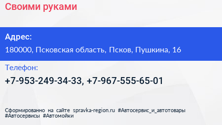 Своими руками по адресу 180000, Псковская область, Псков, Пушкина, 16 в дальнейшем Организация, размещена в следующих категориях: