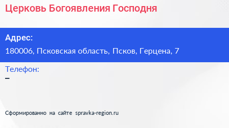 Церковь Богоявления Господня по адресу 180006, Псковская область, Псков, Герцена, 7 в дальнейшем Организация, размещена в следующих категориях: