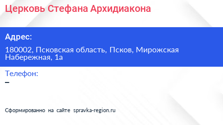 Церковь Стефана Архидиакона по адресу 180002, Псковская область, Псков, Мирожская Набережная, 1а в дальнейшем Организация, размещена в следующих категориях: