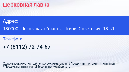 Церковная лавка по адресу 180000, Псковская область, Псков, Советская, 18 к1 в дальнейшем Организация, размещена в следующих категориях: