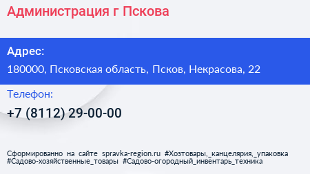 Администрация г. Пскова по адресу 180000, Псковская область, Псков, Некрасова, 22 в дальнейшем Организация, размещена в следующих категориях: