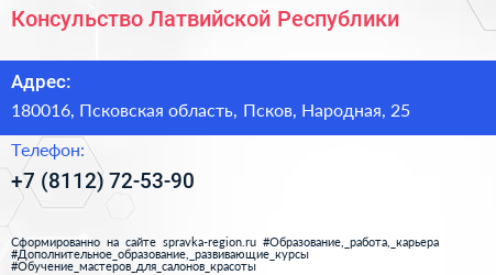 Консульство Латвийской Республики по адресу 180016, Псковская область, Псков, Народная, 25 в дальнейшем Организация, размещена в следующих категориях: