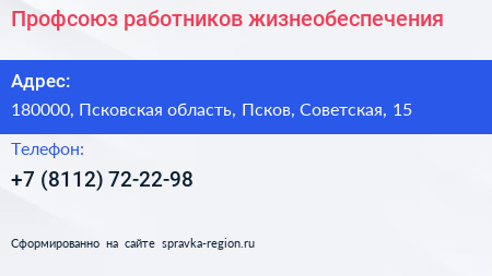 Профсоюз работников жизнеобеспечения по адресу 180000, Псковская область, Псков, Советская, 15 в дальнейшем Организация, размещена в следующих категориях: