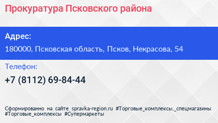 Прокуратура Псковского района по адресу 180000, Псковская область, Псков, Некрасова, 54 в дальнейшем Организация, размещена в следующих категориях: