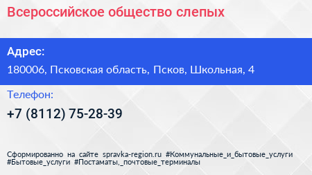 Всероссийское общество слепых по адресу 180006, Псковская область, Псков, Школьная, 4 в дальнейшем Организация, размещена в следующих категориях: