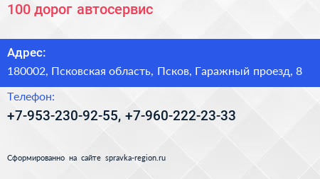 100 дорог, автосервис по адресу 180002, Псковская область, Псков, Гаражный проезд, 8 в дальнейшем Организация, размещена в следующих категориях: