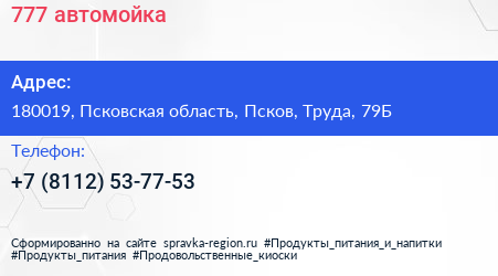777, автомойка по адресу 180019, Псковская область, Псков, Труда, 79Б в дальнейшем Организация, размещена в следующих категориях: