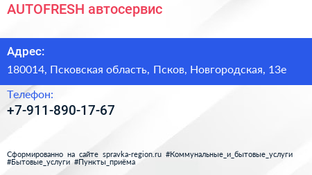 AUTOFRESH, автосервис по адресу 180014, Псковская область, Псков, Новгородская, 13е в дальнейшем Организация, размещена в следующих категориях: