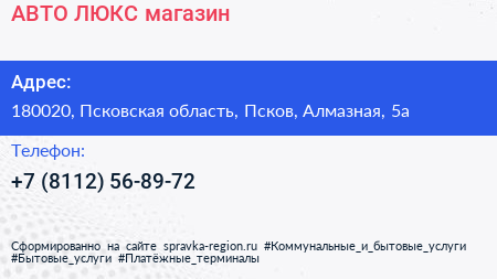АВТО-ЛЮКС, магазин по адресу 180020, Псковская область, Псков, Алмазная, 5а в дальнейшем Организация, размещена в следующих категориях: