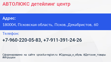 АВТОЛЮКС, детейлинг-центр по адресу 180004, Псковская область, Псков, Декабристов, 60 в дальнейшем Организация, размещена в следующих категориях: