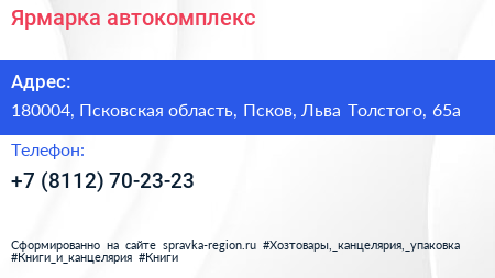Ярмарка, автокомплекс по адресу 180004, Псковская область, Псков, Льва Толстого, 65а в дальнейшем Организация, размещена в следующих категориях: