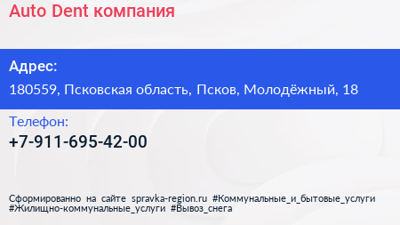 Auto Dent, компания по адресу 180559, Псковская область, Псков, Молодёжный, 18 в дальнейшем Организация, размещена в следующих категориях: