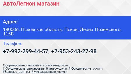 АвтоЛегион, магазин по адресу 180006, Псковская область, Псков, Леона Поземского, 115Б в дальнейшем Организация, размещена в следующих категориях: