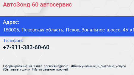 АвтоЗонд 60, автосервис по адресу 180005, Псковская область, Псков, Зональное шоссе, 46 к1 в дальнейшем Организация, размещена в следующих категориях: