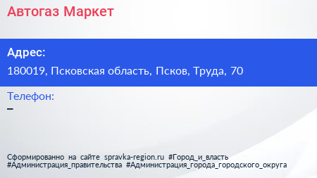 Автогаз-Маркет по адресу 180019, Псковская область, Псков, Труда, 70 в дальнейшем Организация, размещена в следующих категориях: