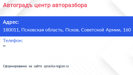 Автоградъ, центр авторазбора по адресу 180011, Псковская область, Псков, Советской Армии, 160 в дальнейшем Организация, размещена в следующих категориях: