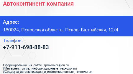 Автоконтинент, компания по адресу 180024, Псковская область, Псков, Балтийская, 12/4 в дальнейшем Организация, размещена в следующих категориях: