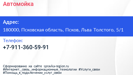 Автомойка по адресу 180000, Псковская область, Псков, Льва Толстого, 5/1 в дальнейшем Организация, размещена в следующих категориях: