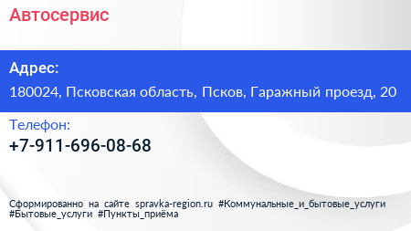 Автосервис по адресу 180024, Псковская область, Псков, Гаражный проезд, 20 в дальнейшем Организация, размещена в следующих категориях: