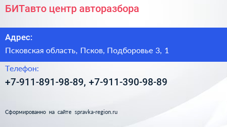 БИТавто, центр авторазбора по адресу Псковская область, Псков, Подборовье 3, 1 в дальнейшем Организация, размещена в следующих категориях:
