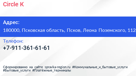 Circle К по адресу 180000, Псковская область, Псков, Леона Поземского, 112а в дальнейшем Организация, размещена в следующих категориях: