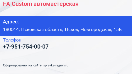 FA Custom, автомастерская по адресу 180014, Псковская область, Псков, Новгородская, 15Б в дальнейшем Организация, размещена в следующих категориях: