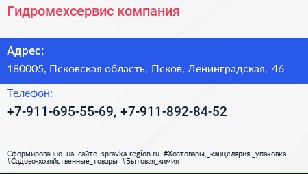 Гидромехсервис, компания по адресу 180005, Псковская область, Псков, Ленинградская, 46 в дальнейшем Организация, размещена в следующих категориях:
