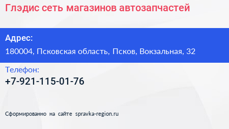Глэдис, сеть магазинов автозапчастей по адресу 180004, Псковская область, Псков, Вокзальная, 32 в дальнейшем Организация, размещена в следующих категориях: