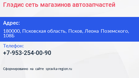 Глэдис, сеть магазинов автозапчастей по адресу 180000, Псковская область, Псков, Леона Поземского, 108Б в дальнейшем Организация, размещена в следующих категориях: