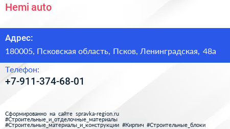 Hemi auto по адресу 180005, Псковская область, Псков, Ленинградская, 48а в дальнейшем Организация, размещена в следующих категориях: