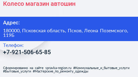 Колесо, магазин автошин по адресу 180000, Псковская область, Псков, Леона Поземского, 119Б в дальнейшем Организация, размещена в следующих категориях: