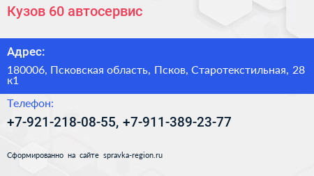 Кузов 60, автосервис по адресу 180006, Псковская область, Псков, Старотекстильная, 28 к1 в дальнейшем Организация, размещена в следующих категориях: