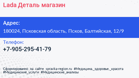 Lada Деталь, магазин по адресу 180024, Псковская область, Псков, Балтийская, 12/9 в дальнейшем Организация, размещена в следующих категориях: